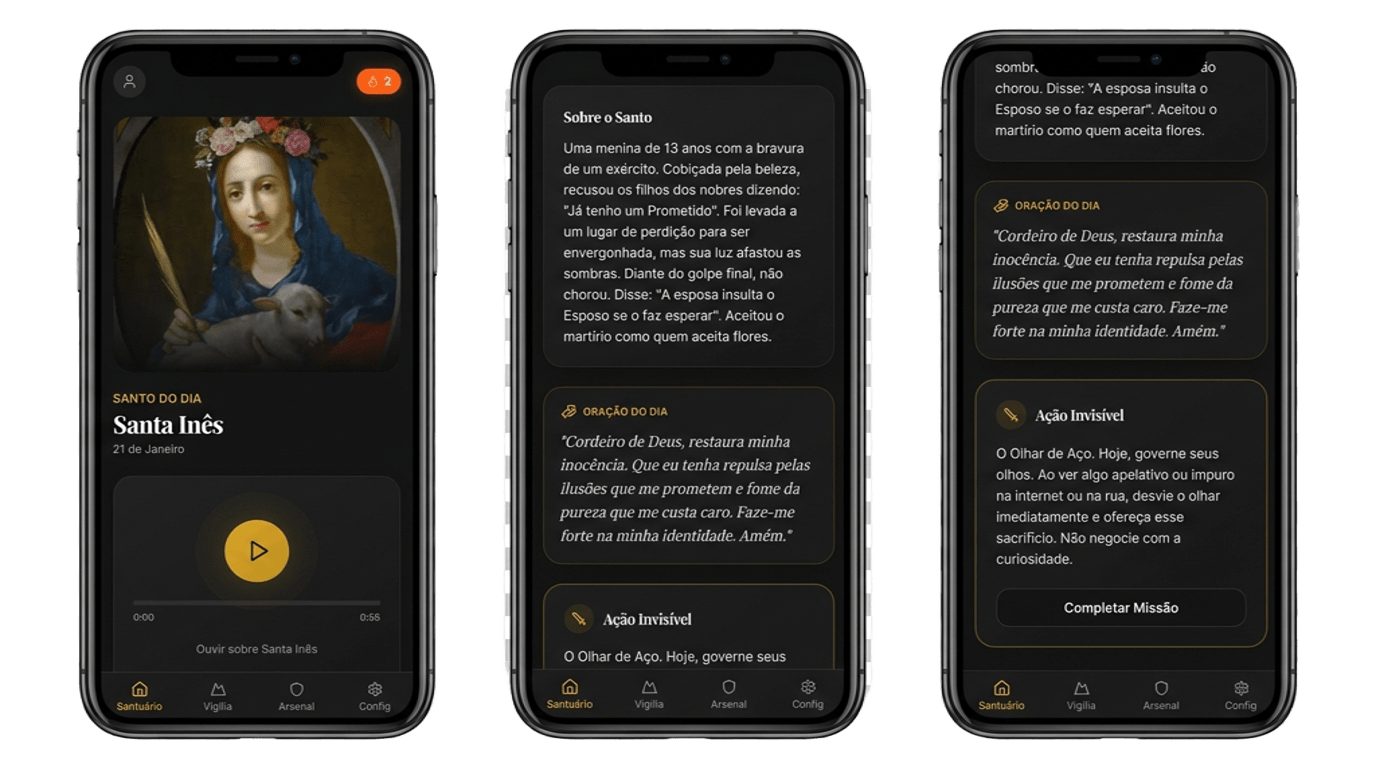 Por fim, o sistema entrega uma missão prática. Algo simples, silencioso, possível: um gesto de caridade, um pequeno sacrifício, uma atitude diferente no cotidiano. É aqui que a fé sai do papel e entra na vida real.